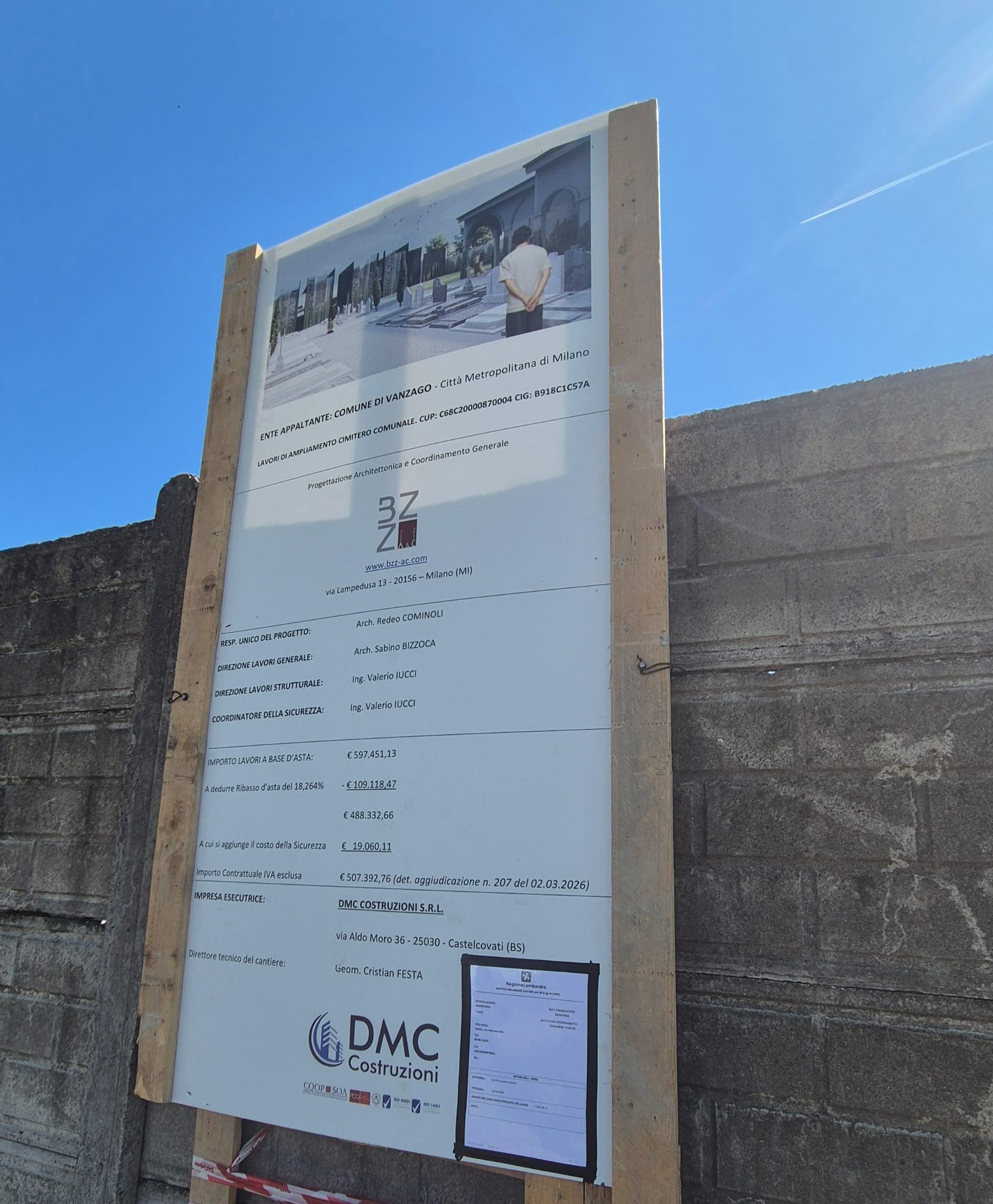 Nella mattinata di mercoledì 8 aprile 2026, alla presenza del Direttore Lavori, del Responsabile Unico del Procedimento e dei referenti dell’azienda DMC COSTRUZIONI SRL, è stato sottoscritto il verbale di consegna dei lavori di ampliamento del Cimitero di via P. Ferrario.