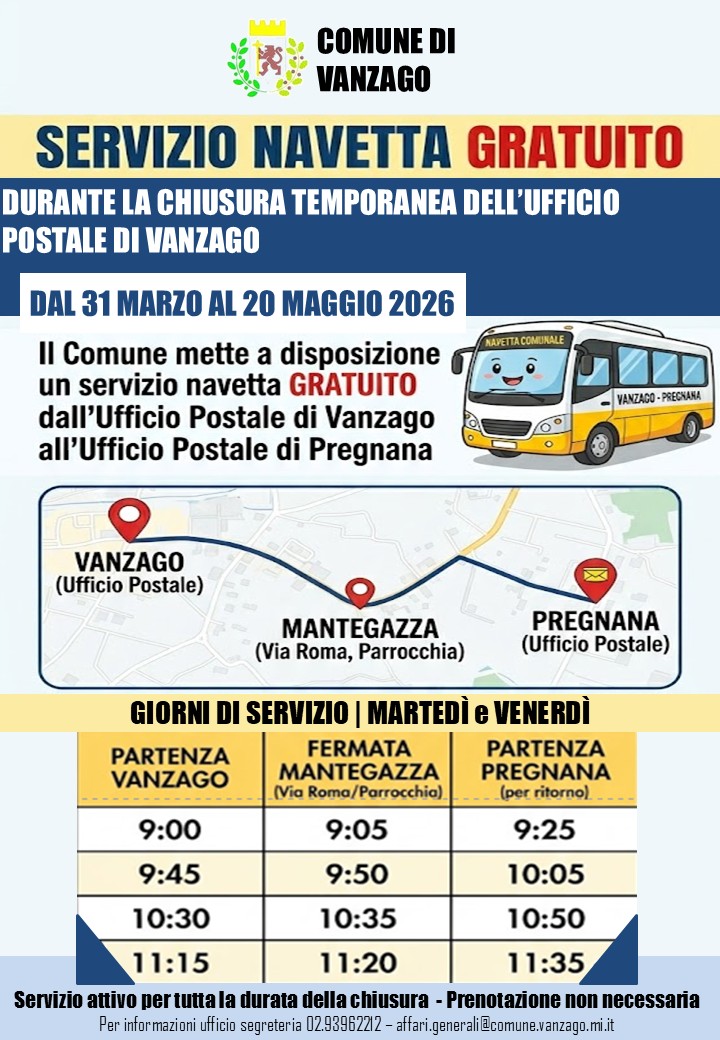 A seguito della temporanea chiusura dell’Ufficio Postale di Vanzago comunicata da Poste Italiane, il Comune di Vanzago ha attivato un servizio navetta gratuito per garantire ai cittadini la possibilità di raggiungere l’ufficio postale di riferimento presso Pregnana.