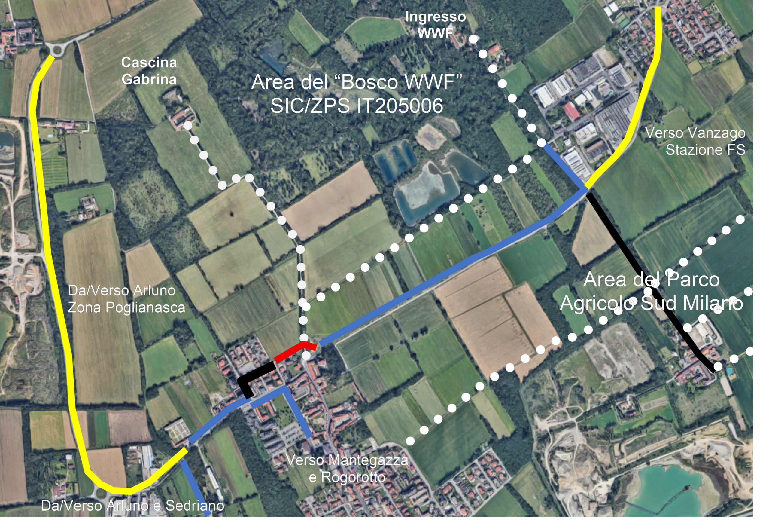 Collegamento ciclopedonale Data Center Sedriano (in rosso), Piste ciclopedonali già esistenti (in blu), Piste ciclopedonali in realizzazione con Data Center Vittuone e Potenziamento Rho-Parabiago (in giallo), Strade bianche e principali sentieri (in bianco), Collegamenti stradali utilizzabili da bici e pedoni (in nero)
