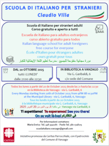 Prende nuovamente il via, lunedì 20 ottobre 2025 , la scuola di Italiano per stranieri adulti “Una lingua, mille popoli”. L’iniziativa permette, già da diversi anni, di offrire un corso di Italiano ed altre iniziative ad esso collegate, per sostenere persone straniere presenti nella nostra comunità attraverso occasioni di dialogo e percorsi di integrazione.