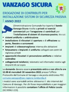 Vanzago Sicura 2022 | Erogazione di contributi per installazione di sistemi di sicurezza passiva
